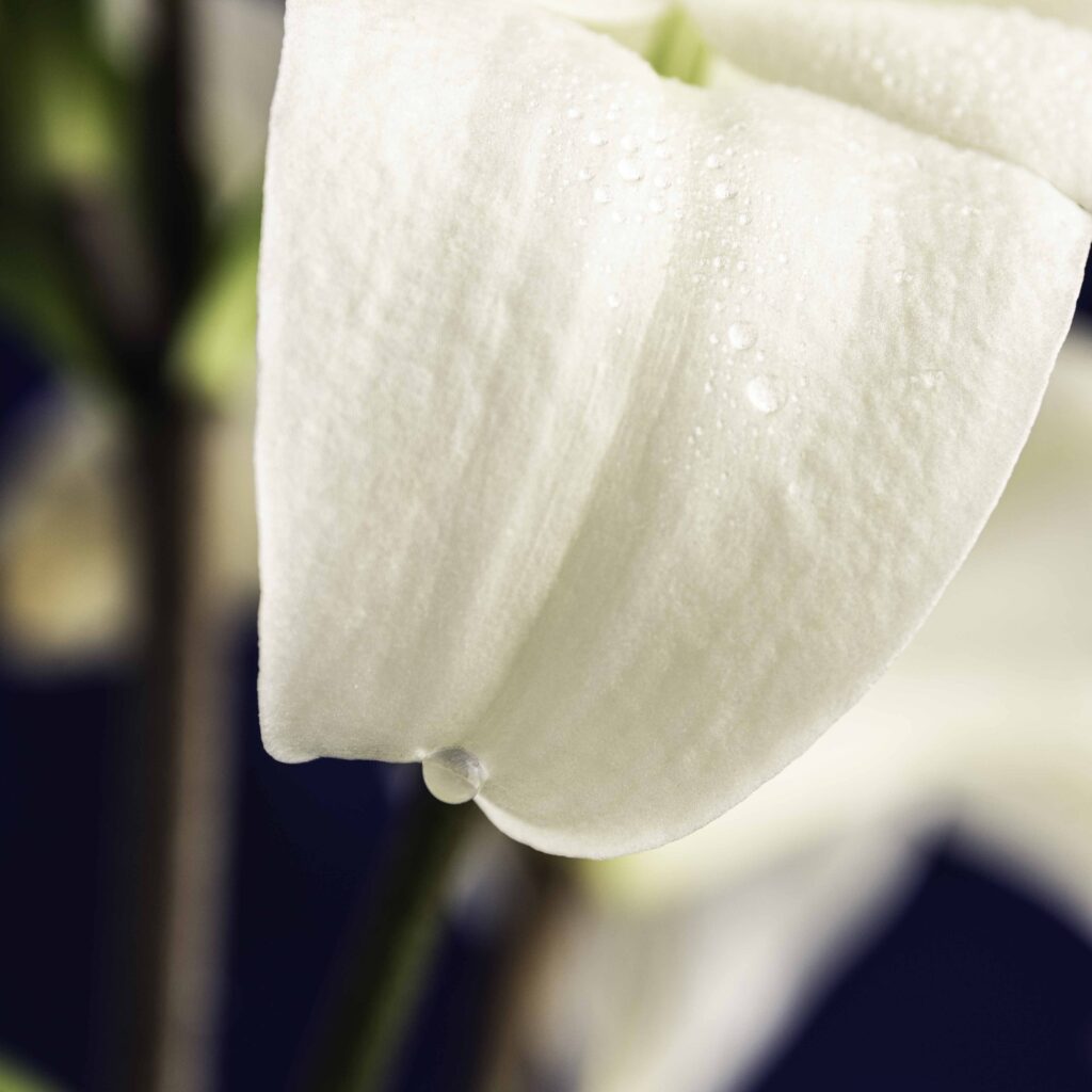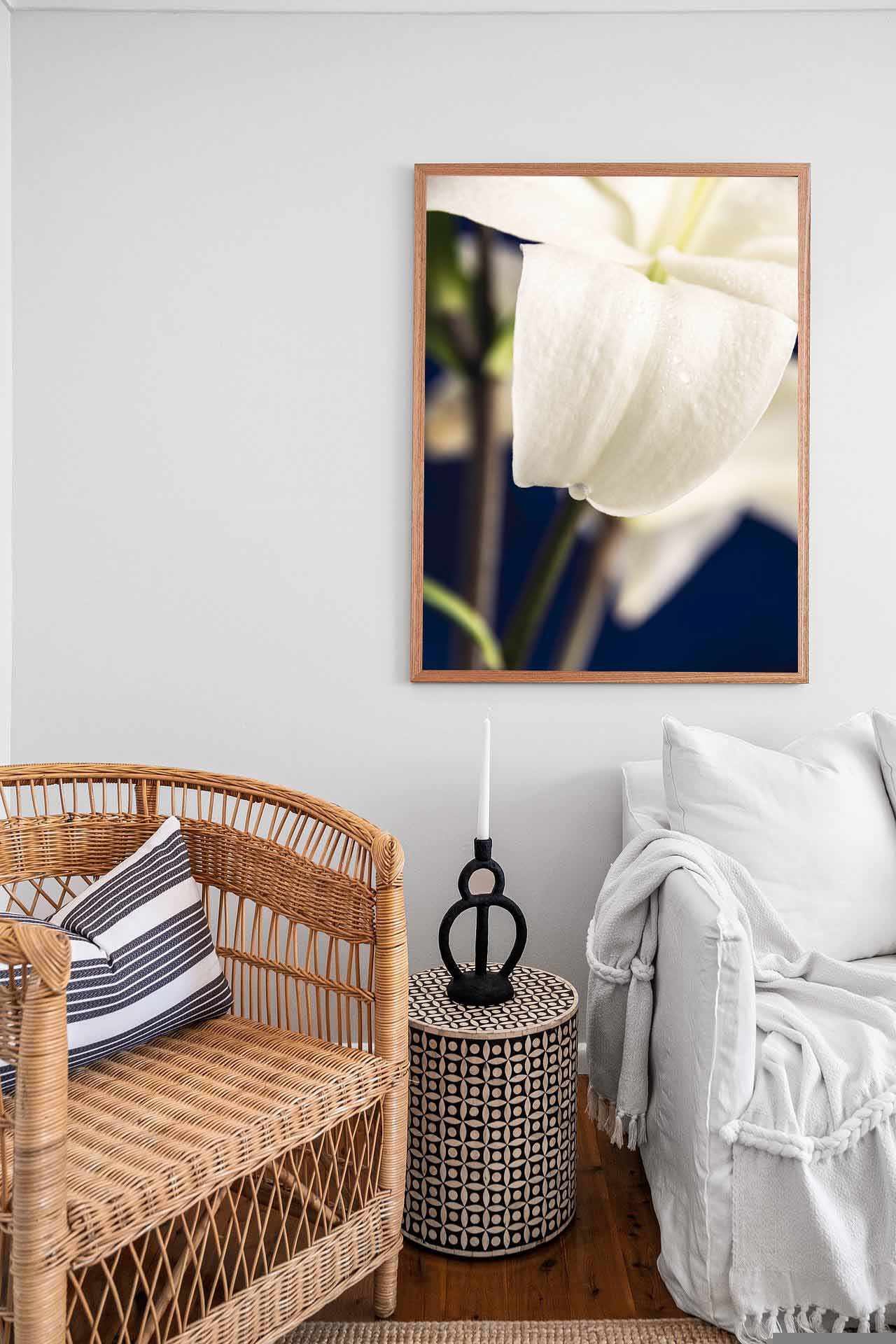 Transforma tu espacio preferido en un lugar de distinción con una obra que captura la esencia misma de la belleza natural. La suave curva del pétalo de una flor blanca sobre un fondo azul invita a contemplar la delicadeza y la simplicidad de la vida, recordándonos que la verdadera belleza se encuentra en los detalles más pequeños.