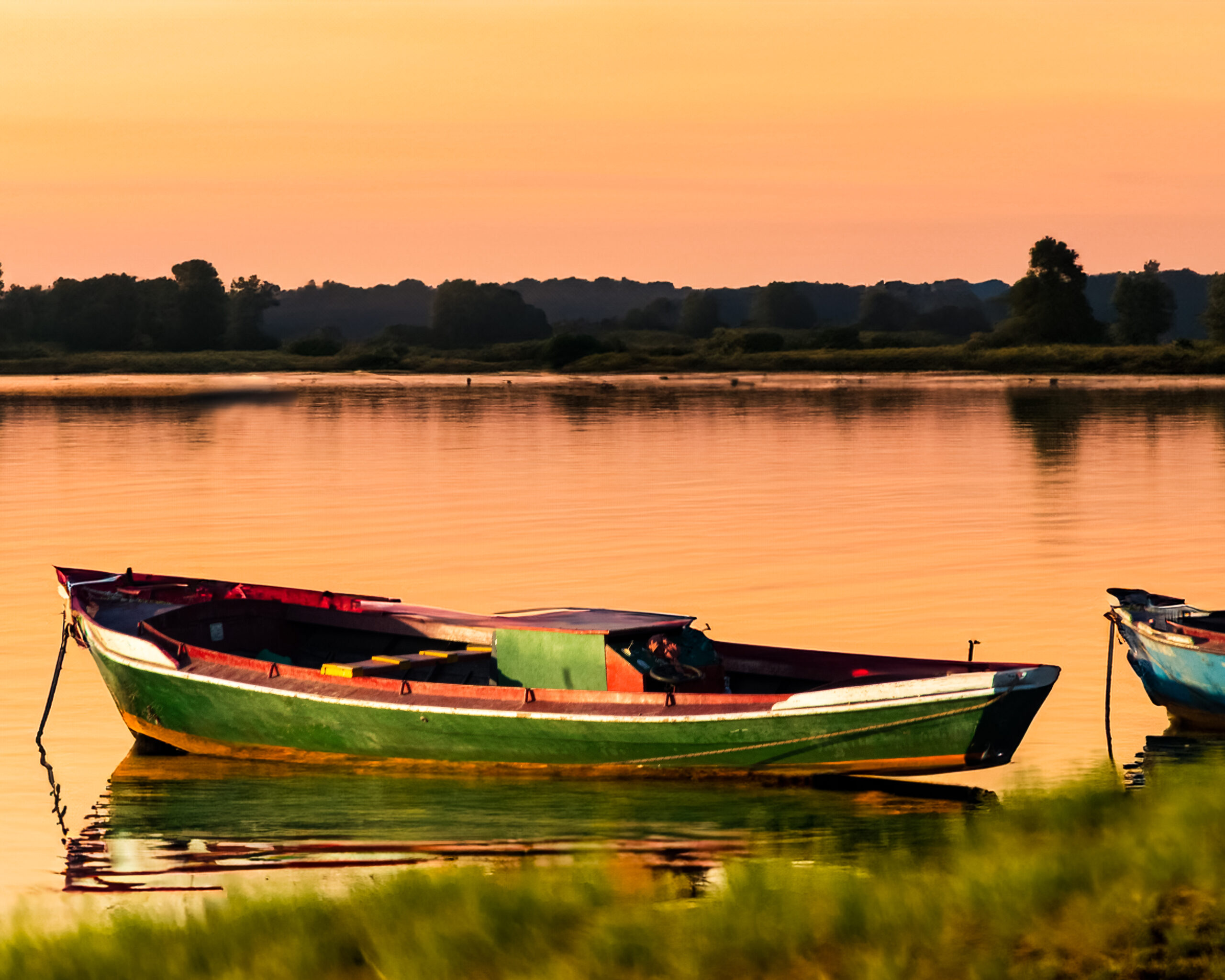 Un solitario bote flota suavemente sobre un lago en calma, bañado por la luz cálida del atardecer. Los tonos dorados y las aguas tranquilas invitan a una pausa interior, evocando quietud, equilibrio y claridad mental. Una imagen pensada para aportar serenidad al espacio de trabajo, favoreciendo la concentración y el bienestar.